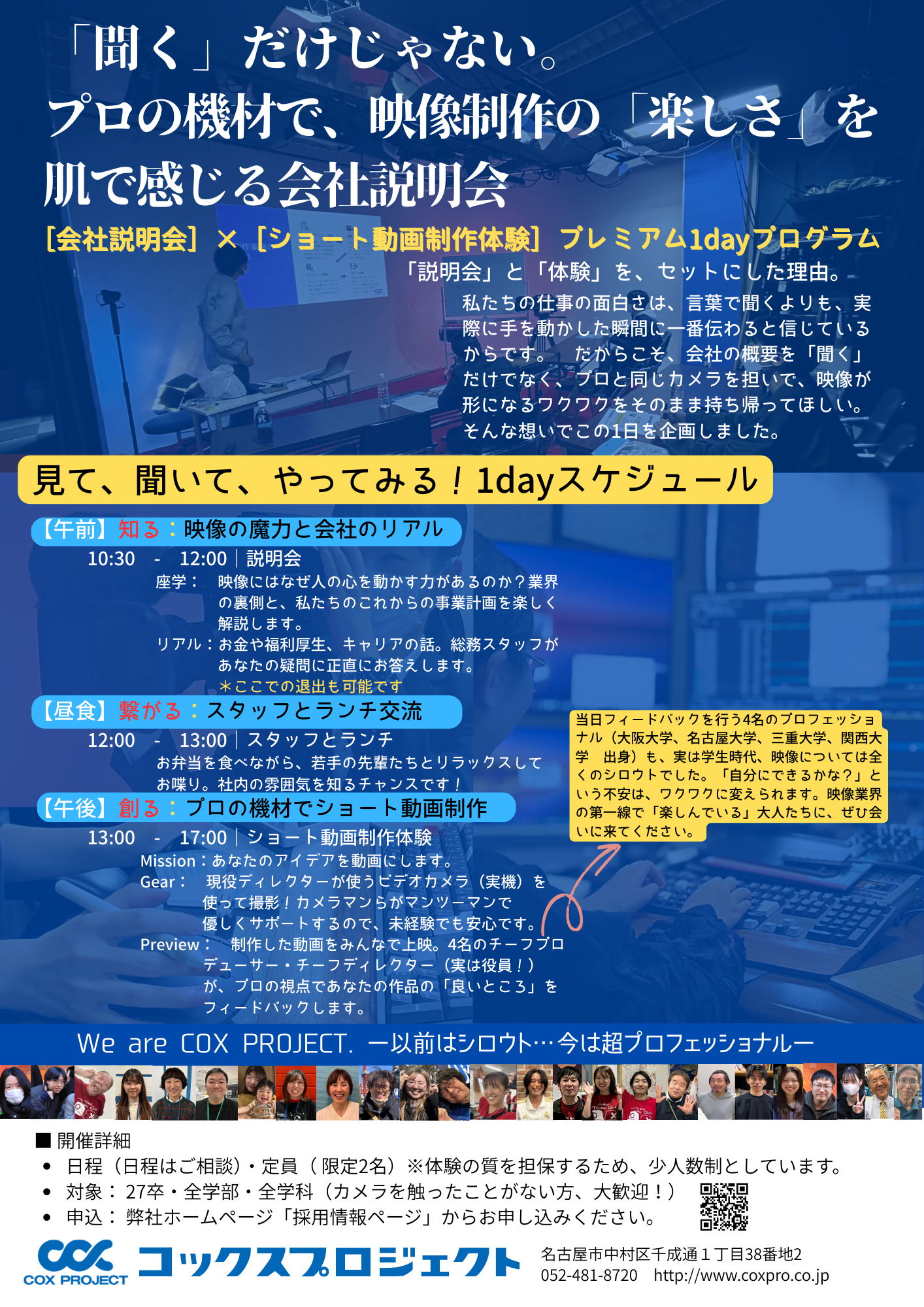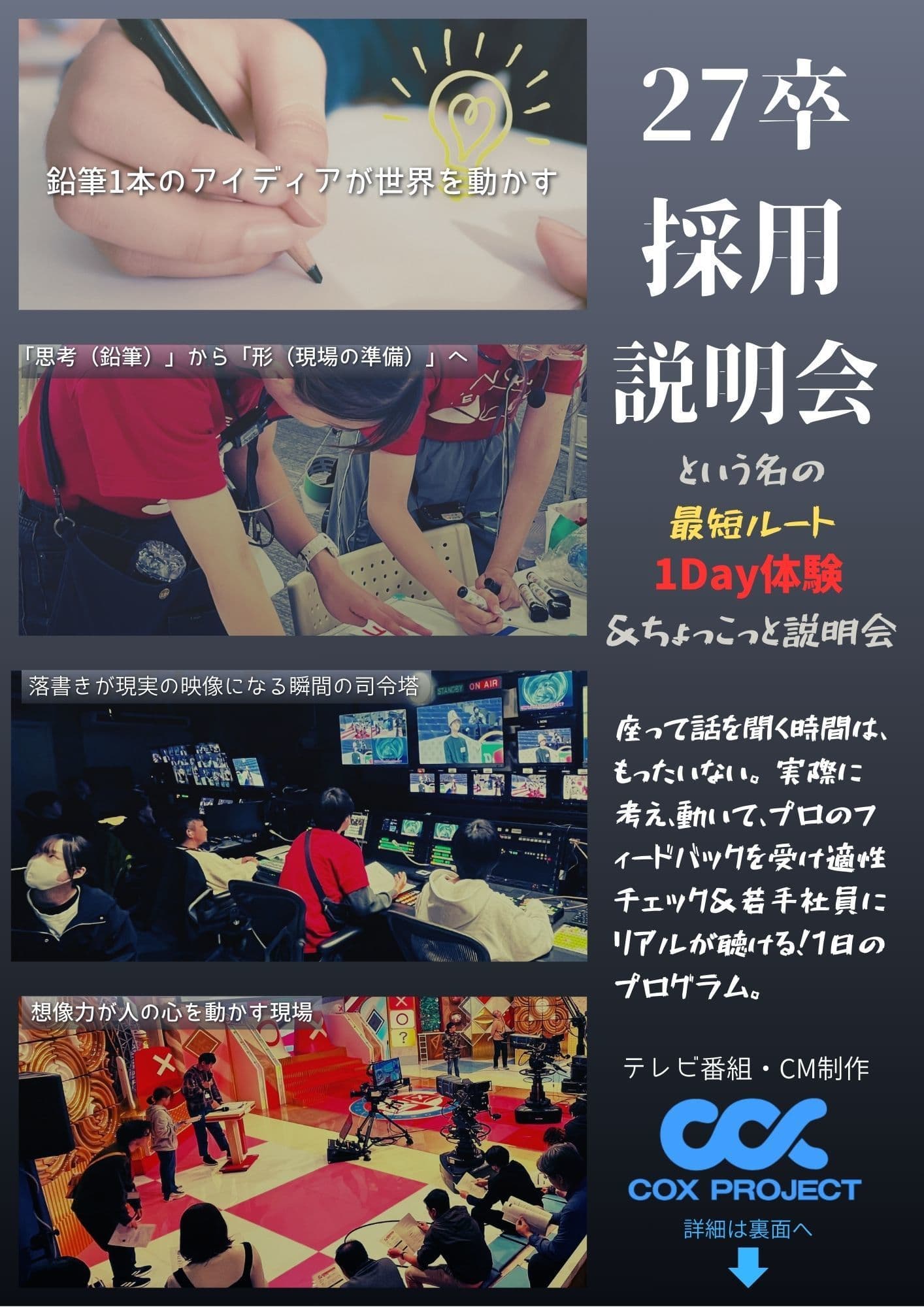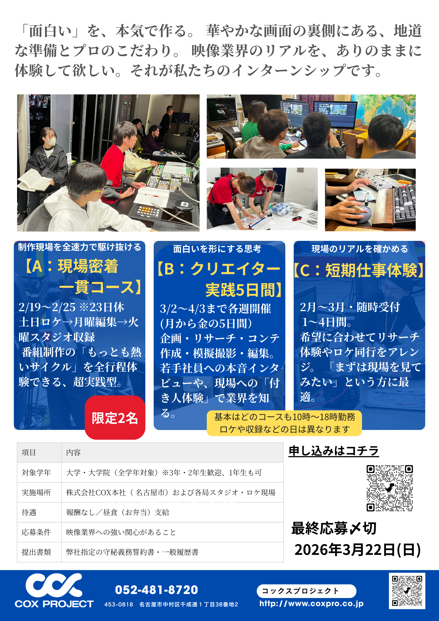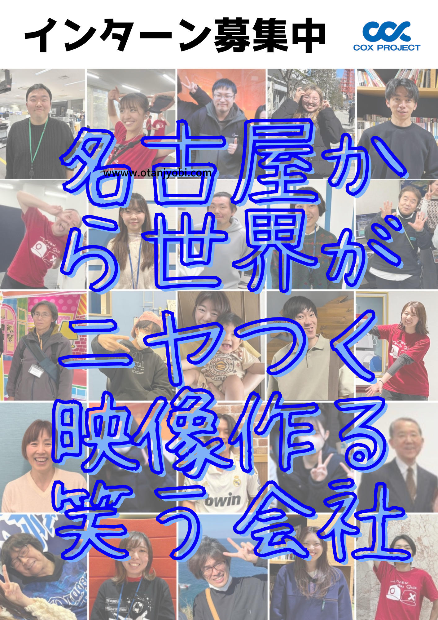 仕事内容 テレビ番組やCMなどの映像制作。企画立案を行い放送局などへ提案しコンテンツを制作しています。 撮影技術は自社の企画案件の撮影や、編集も行います。弊社では制作部に属する「制作技術」です。 募集職種 採用数は3名前後。募集職種は、将来的にディレクター・プロデューサーを目指す総合制作職。 および、カメラマン、音声などを目指す撮影技術職。撮影技術職から総合政策職へ、あるいはその逆の の社内異動もあります。 入社時はアシスタントディレクターとして勤務して頂き、適性に応じ担当業務が割り振られます。 経験不問 映像に関する専門技術の知識、経験は必要ありません 会社の特徴 業務に対して「ココロ踊るシゴトをしよう」という合い言葉を掲げています。 楽しく仕事をすることが、良い作品を作り、各個人の高評価につながると信じています。 名古屋の独立系プロダクションの老舗です。特定のテレビ局の系列に属さず、自社の企画力と技術力で 50年以上も業界で活躍してきた実力派の会社です。 会社の強み ローカルから全国区まで、幅広い制作実績 公式サイトなどを見ると、中京テレビ「オモウマい店」やメ~テレ「ドデスカ!」といった地元の人気 番組から、読売テレビ制作の「ダウンタウンDX」のような全国ネットの番組まで、制作協力の実績は 多岐にわたります。これは独立系ならではのフットワークの軽さと、各局からの信頼の厚さを示してい ます。 「待ち」ではなく「攻め」の企画力 コックスプロジェクトは、テレビ局からの発注を待つだけでなく、自ら「こんな番組はどうですか?」 と企画を持ち込んで番組化することを強みとしています。自分のアイデアを形にしたいというクエイ ター志向の強い人には、非常にやりがいのある環境です。 必要なPCスキル ワード、エクセル、パワーポイント 採用における得意特出能力の加点 外国語の資格、部活などによる大会の成果、 (映像コンテンツの海外進出も行っています) 得られるキャリア 演出・撮影・編集に関する高度な技術・デザイン・構成演出手法の学び スキルを身につけ編集業務でリモートで在宅ワークも可能 映像制作だけでなく、イベント、集客を含めたノウハウ プロモーション全般に関する知識とネットワーク構築