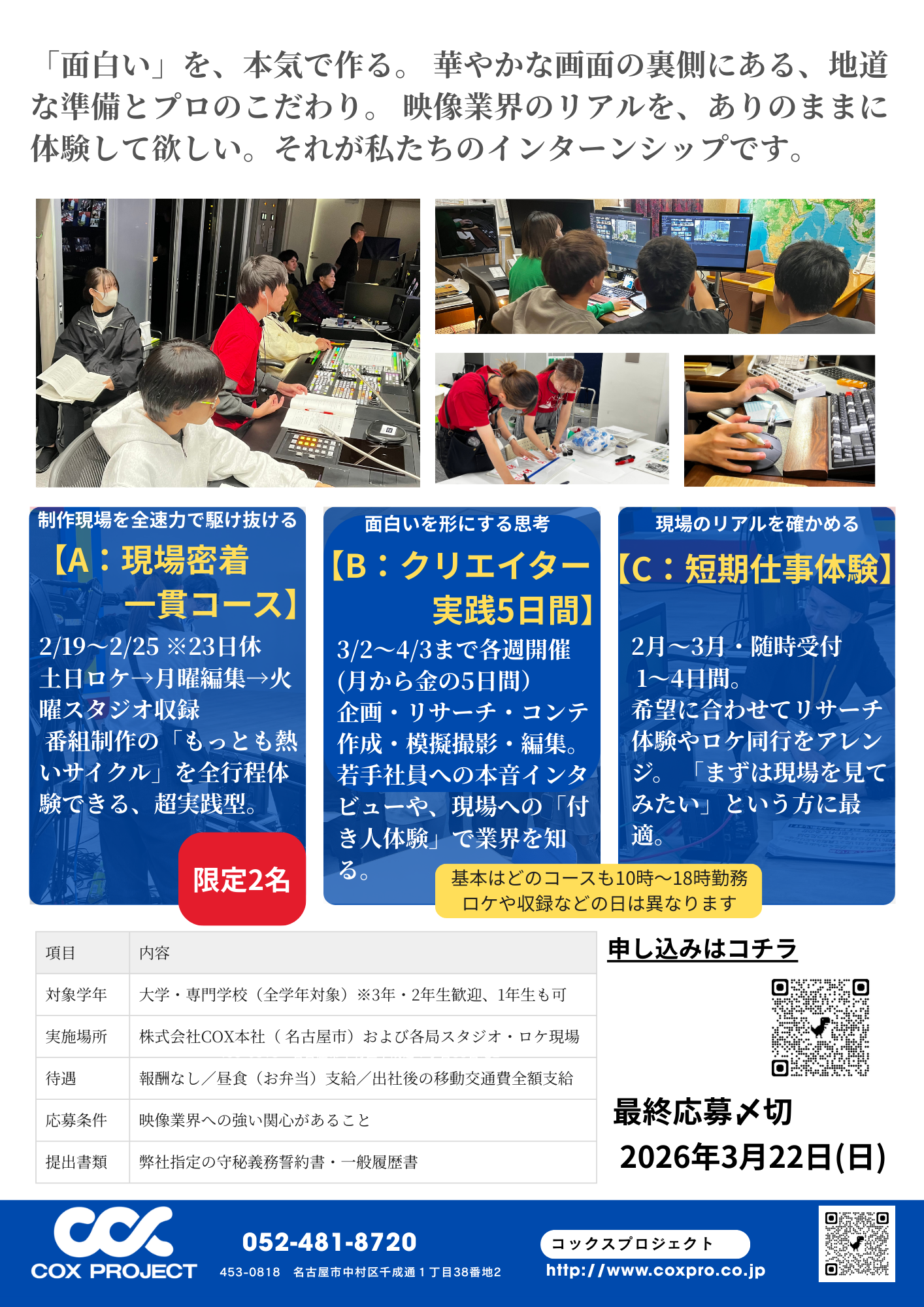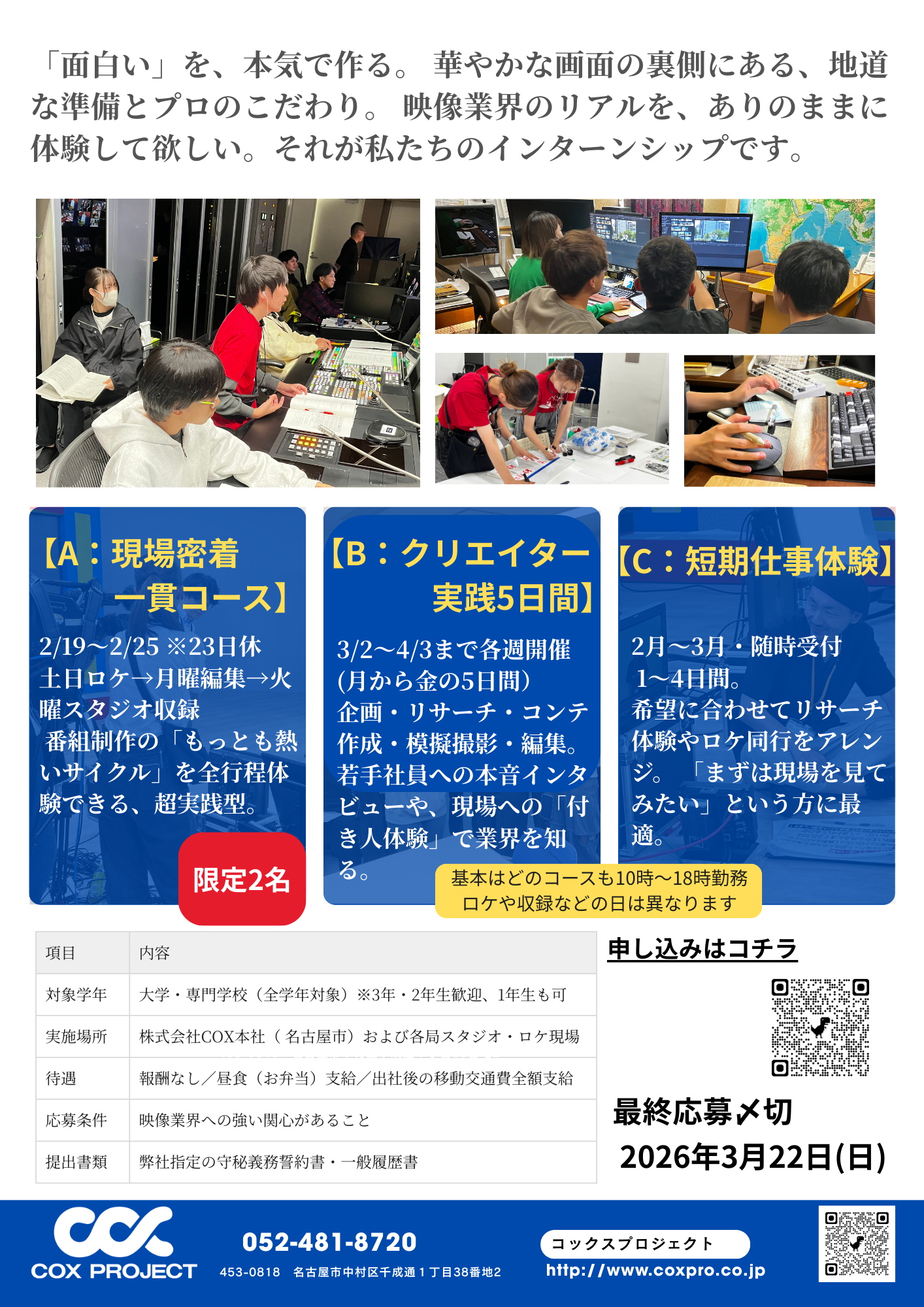 【A】現場密着一貫コース(限定2名): 2/19〜2/25の特別日程。ロケ・編集・スタジオ収録まで、制作の「最も熱いサイクル」に完全密着。