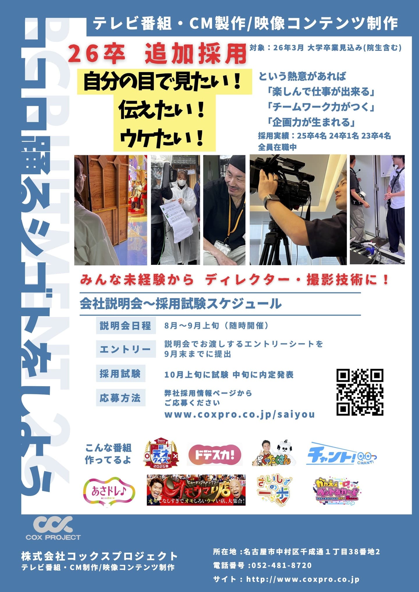 株式会社コックスプロジェクトは、優秀なスタッフの募集を毎年行っております。2026年も採用の計画を立てております。まずは採用ページをご覧下さい。そしてご質問だけでもお気軽に、下記のフォームからお問い合わせください。エントリー内容を検討のうえ、後日、弊社採用担当者より改めてご連絡をさせていただきます。